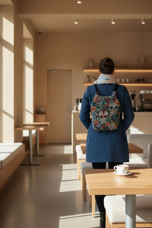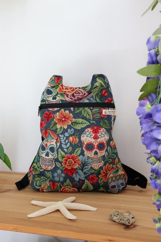 Nuestra mochila mujer de vestir Calavera está confeccionada a mano, en el Rincón de la Victoria y cada detalle está cuidadosamente creado para garantizar piezas únicas, auténticas y resistentes.