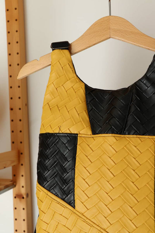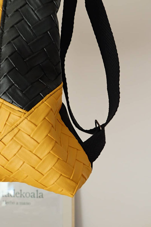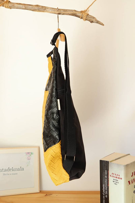 Exterior delantero. Elaborada con polipiel negra brillo y polipiel mostaza mate. Trasera con tejido repelente al agua color negro.